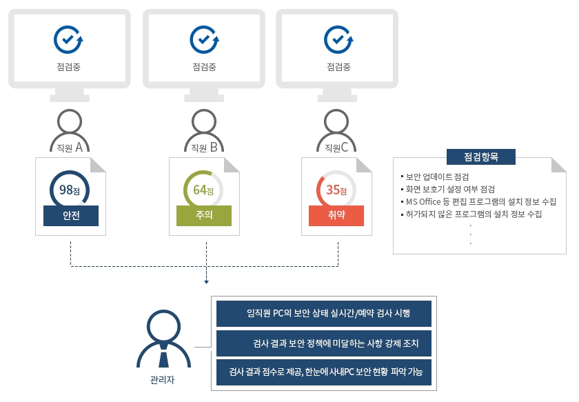 - 실시간 또는 일정 주기 기준으로 사내 PC의 취약점 점검